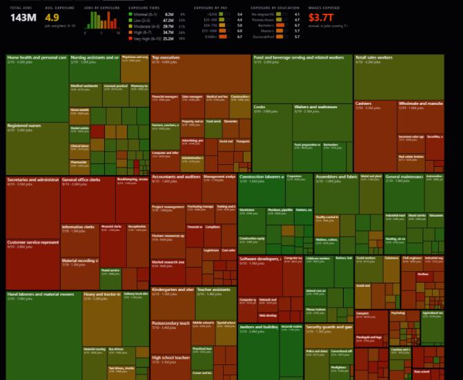 US Job Market Visualizer,越红代表越容易被替代,越绿代表越安全。